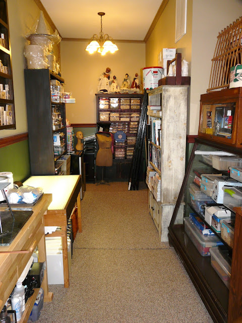 Standing at the front door looking to the right. You can actually see the top of the 8' display case now! That will never last. I tend to work on this as it is a very comfortable height. I like to stand when I work unless it's a job I have to sit for.